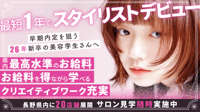 「生涯現役の美容師でいたい」「出産しても働きたい」「サロンオーナーになりたい」「ヘア以外の技術も身につけたい」 美容師の数だけ、その想いがあります。そして美容の道もひとつではありません。長野県内にエリアでは初の本格的なトータルビューティーサロンとして、美容師・スパ二スト・アイデザイナー・エステティシャン・フロントなど美容に関わる多様な働き方に柔軟な対応をしています。