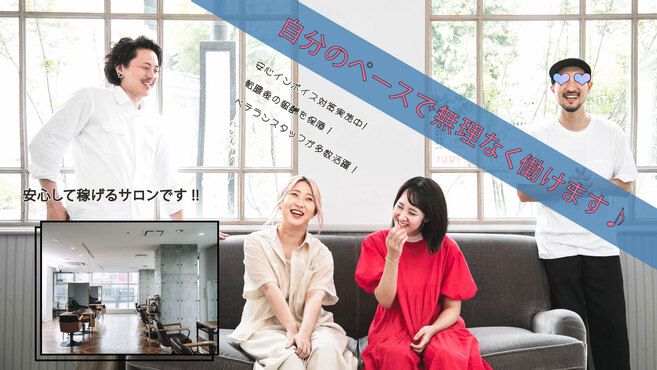 正社員スタイリストさん: アクセスも良く、以前勤めていたサロンからお客様も引き続き通いやすかったためです。料金設定も以前のサロンと同様の金額ですが、歩合がよりいいので、給与面も今までより良くなりました。また、働いてるスタッフの世代が同じぐらいで、楽しく働いる印象を受けたのが、きっかけです。
