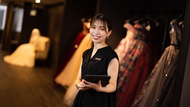 イタリア・NYのトップブランドを取り扱う。旬なデザイナーによる最新のラインナップ。インポートアクセサリーも数多く、店内はいつも華やかです。大切な一日の為に特別感を満ち与え、さらに挙式当日まで喜びを分かち合いながら準備をすすめてまいります。お客様のご要望にお応えしながら自身も向上できる素晴らしいお仕事です。