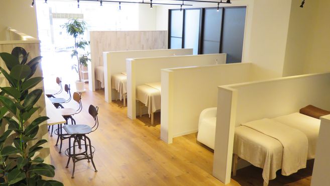 ベッド6席、リクライニングソファ4台の全10席の1階路面店サロンです。明るく広々とした働きやすいサロンをご用意しております。