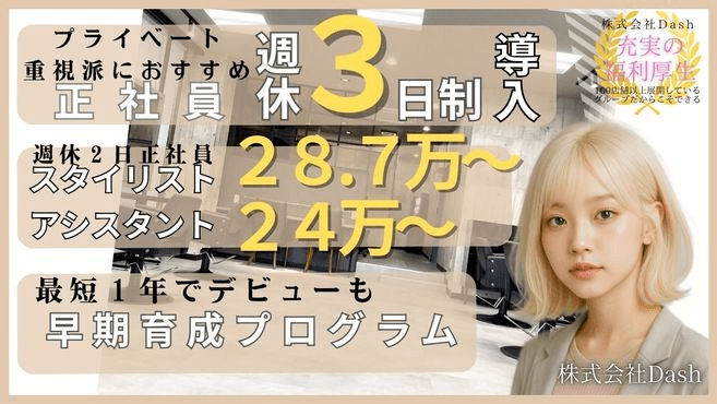 自然と技術が身につき成長できる。そんな環境がDashの魅力です。先輩や、同期と一緒に楽しく練習する日々。刺激もあって楽しいです! アシスタントはカリキュラムがしっかりしているので1年ほどでスタイリストになる人もいます。プロジェクトチームによるトレンドなスタイルの紹介や、会社負担で内外部の講習が受講できるのも魅力!Z世代カリスマ美容師による動画教育サポートも充実!