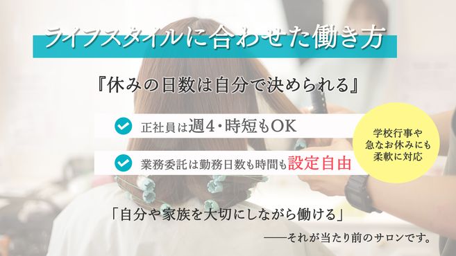 私たちは、ライフスタイルに合わせて「正社員」「業務委託」を選べる環境を整えています。どちらを選んでも、美容師として安心して長く活躍できます。