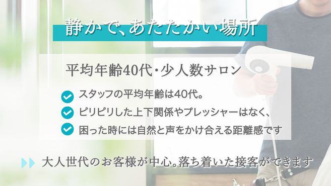 私たちは「自分を犠牲にしない働き方」を大切にしています。落ち着いた環境で、美容師としてもう一度輝きたい方にぴったりの場所です。