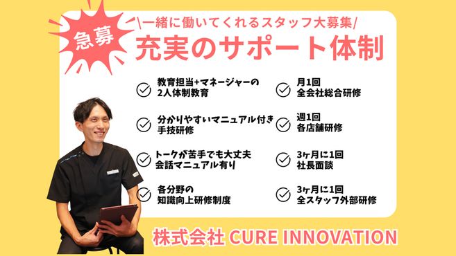 マンツーマン指導+マネージャー指導。手技やトークも基本マニュアルがあり、働きやすい環境づくりを心掛けています。シフトも2カ月前にはできるので、プライベートの予定も立てやすく、有給はオンライン申請なのでとても取りやすいです。