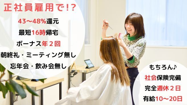 仕事仲間として仲が悪いわけではありませんが、「飲み会」や「社員旅行」なども無くし、その分「賞与」にしっかり還元する事や「形だけになりがちな朝礼や終礼を無くす」「自分のお客様が終わったら早く帰る」などプライベートも大切にしたりと、今までの「美容室で働く環境」でいらないと感じる部分は極力省いています♪
