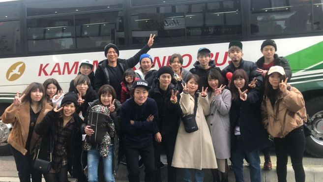写真は昨年の社員旅行の時の写真です。全員でバスに乗り、スキー/スノボー旅行に行きました!