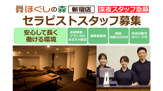 どんどんスキルアップしてもらい、「ほぐしの森」の人気セラピストとしての地位を確立していただくよう全力でサポートいたします。