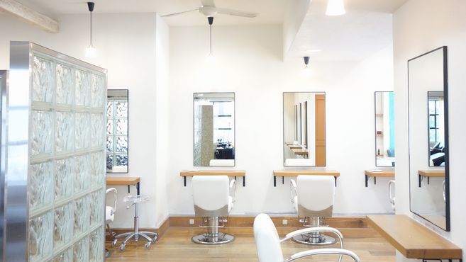 大きな窓から優しい光が差し込む、明るくセンスあふれる空間にセット面8席とシャンプー3台。入口からは想像できないほど、奥に広い造りなので外からの目線を気にすることなく快適に過ごしていただいてます♪
