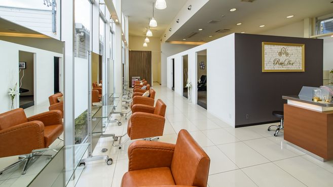 40坪にセット面8席、シャンプー台はyumeシャン、そしてネイルブース。ゆとりを持たせた開放的な空間なので新型コロナが心配というお客様にも「ここなら程よい距離があって安心」と喜んでもらっています。スタッフ同士は和気あいあいとした雰囲気です^^