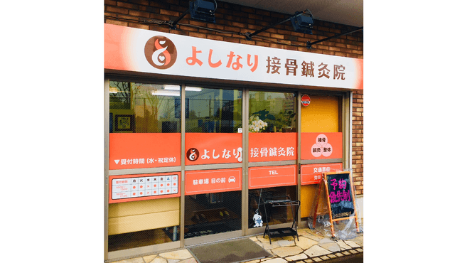 - よしなり接骨鍼灸院の「よ」を派生させ、「心で接する」「与える」体の芯である「脊椎部」を表したロゴになっています。