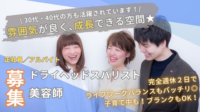 オリジナルの快眠ドライヘッドスパ技術があるので、経験問わず1~2か月の研修を受けていただきます。技術はもちろん、接客なども独自のマニュアルがあるのでご安心ください♪ヘッドスパコンテスト全国大会ベスト8になった角さんをはじめ、技術に定評ありの先輩たちが指導担当になりますが、入客が始まった後も勉強会があるので、定期的に技術チェックを行いブラッシュアップしていきましょう^^