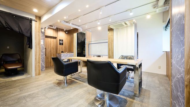 セット面5席、一カ所はカーテンで仕切り半個室になるので、着付けはそこで行います。セット面はゆったりとして周りの眼が気にならない大人の空間♪全体を見渡しやすい広々とした店内でのびのび仕事ができます♪