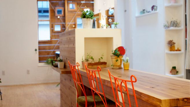 店内は天井から自然光が差し込み木の温もりの店内、