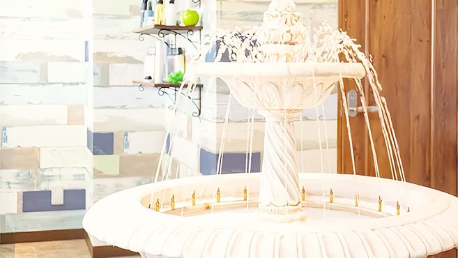 店内の噴水を中心にカラフルで活気溢れる市場をイメージさせる、石畳とエイジングウッドの店内-marche-。屋外のような開放感が◎。プライベート感のある『個室』と『フルフラットベッド』でのヘッドスパやトリートメントがお勧め。担当者による完全マンツーマン施術で、リラックスしながら似合うstyleを見つけて下さい。