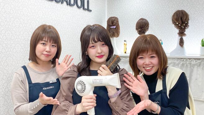 私は普通の美容室ではなく大好きな美容師の仕事を活かしながら髪に事情を抱えたお客様の希望する髪型作りに関わる仕事がしたいと思い調べたところ『医療用ウィッグ』と『アクアドール』に出会いました。最初はウィッグをカットするのに戸惑うこともありましたが今は一人ひとりお客様に向き合いながらウィッグに対するご要望をお伺いし一生懸命作ったウィッグを気に入ってくださったときのお客様の笑顔がなによりも嬉しいです。