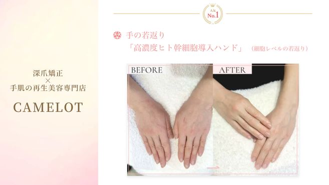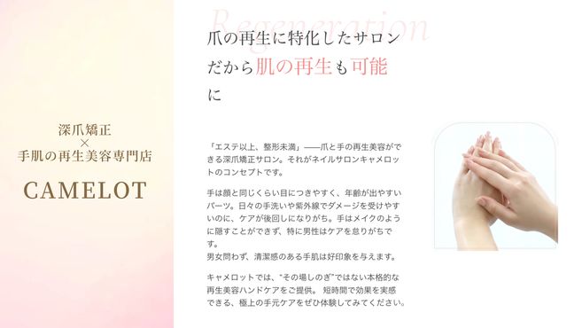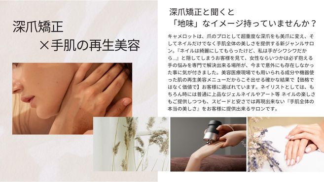 キャメロットでは「深爪矯正」と「美肌再生メニュー」に特化し、