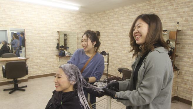 30代~20代のスタッフで女性のみのサロンです。お子様連れでの勤務をしているパートさんや高校卒業後入社し、通信で美容学校に通いながら勤務しているスタッフもいます。