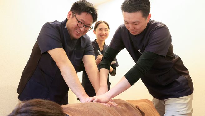 最初の1カ月、治療の基礎を座学&技術ともに学びます。(代表と幹部が指導するので、わからないことや困ったことは、その都度何でも聞いてください)。できることから患者様を担当してもらいつつ、その後のフォローアップ研修で、さまざまな症例に対応できる治療家になれるようしっかりサポートします。