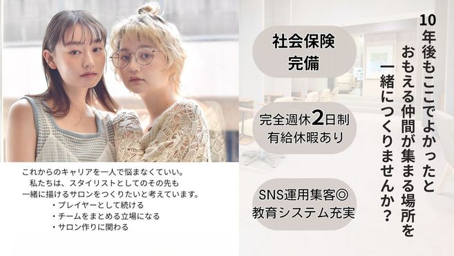 「スタッフの夢が叶う」「毎日職場に行くのが楽しみ」そんな笑顔の溢れる美容室を作りたくて独立しました。楽しく一つ上の技術を一緒に学ぼう。