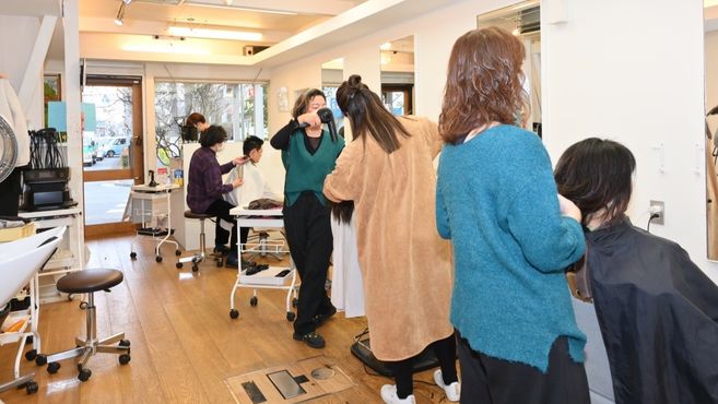 「誰が担当しても安心して任せてもらえる」を目標にしているので、再現性の高いカットはもちろん、カラー、薬剤、ホスピタリティ(おもてなし)の接客など、オーナーが中心となって丁寧に指導しています。3年を目安にJrスタイリストデビューを目指しますが、「私は不器用だから…」「もっと早くデビューしたい!」などあればそれもOK♪一人ひとりに合ったカリキュラムを組むのでご安心ください。レッスンは基本営業中で週に2回の朝練。時間外の強制練習はしていませんが、わからないことがあったらいつでも気持ちよく時間を取るのでお声かけください。