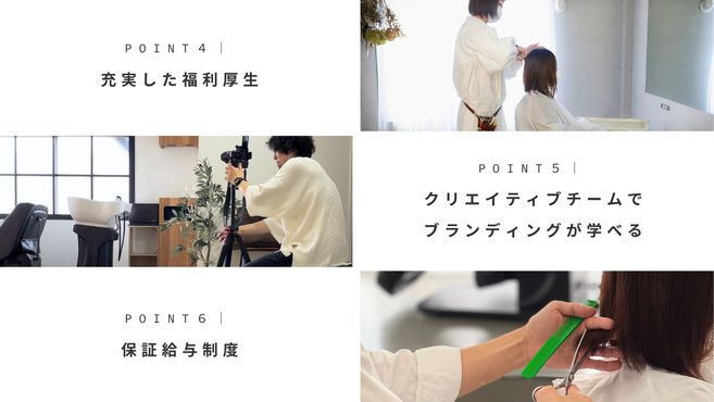 福利厚生も充実しています。ハサミの研ぎ補助、健康診断、他サロンでの施術補助など、働きやすい環境を整えています。