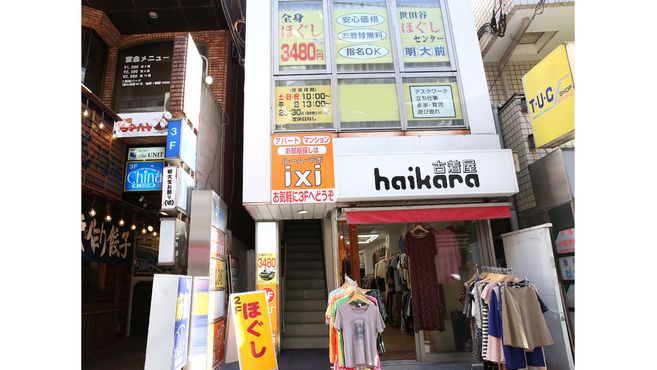 京王線・京王井の頭線明大前駅から徒歩1分 メイン改札出て右手にある切符売り場を通過したら右折。直進して40メートルほど。右手に「ほぐし」の立て看板が見えます。油そば春日亭の隣のビルです。