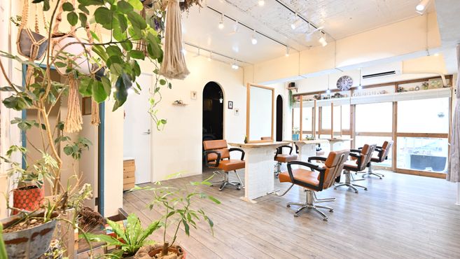 セット面8席、フルフラットシャンプー3台、店内写真を見ていただくと伝わるかもしれませんがおしゃれなカフェのような癒しと解放感のあるサロンです。サロン見学に来て、アロマクリームバスのすてきな香りと穏やかな雰囲気をぜひ感じてくださいね☆スタッフも癒し系が多いので和気あいあいな雰囲気です♪