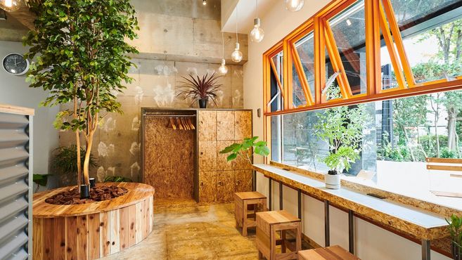 自然と調和する有機的なデザインの店内で