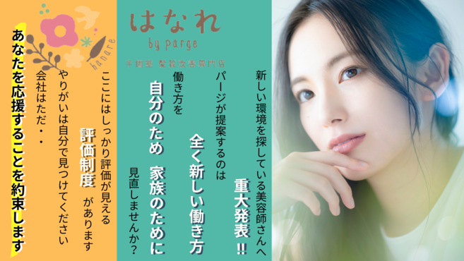 「パージ はなれ」で、スキルを活かし、仲間と共にお客様の美しさと笑顔を創り上げる仕事をしませんか?私たちと一緒にお客様の特別な存在としての体験を共有しましょう。あなたの才能を発揮できる場所として、私たちがお待ちしています。