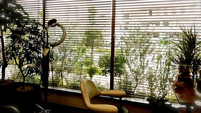 緑あふれる落ち着いた店内。ウッドブラインドから優しい陽の光が入る隠れ家サロンです。