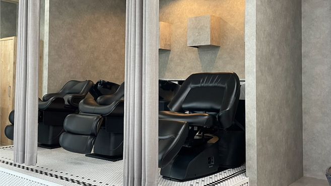 カーテンで仕切ることができ [ 頭浸浴 ] など顧客をリラクゼーションに誘う環境。