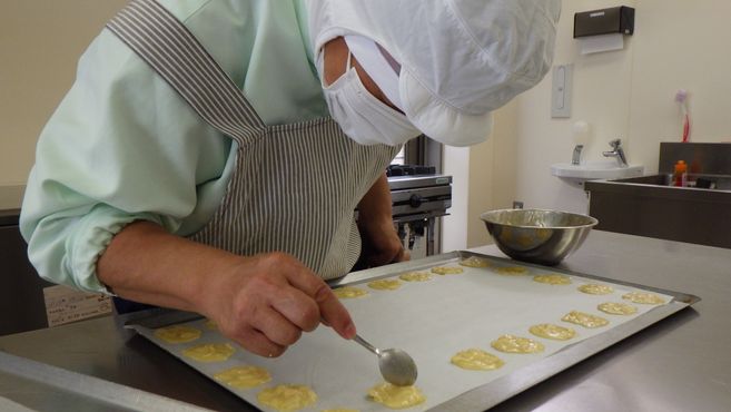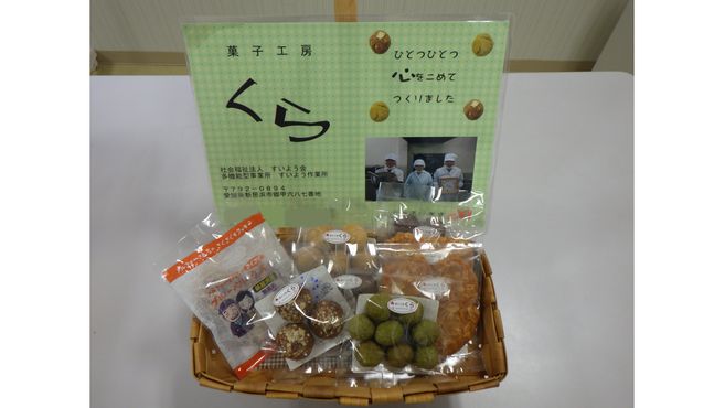 - 菓子工房「くら」、当事業所の製菓部門になります。写真は商品一覧になります。「くら」の由来は事業所の前に蔵の内池があるのでそこから命名しました。できる限り国産の材料にこだわり一つ一つ手作りの商品になります。