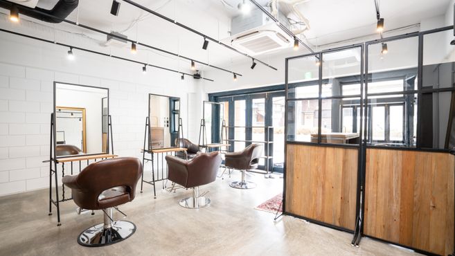 サロンの雰囲気は、広々した空間に、ヴィンテージ調とナチュラルなイメージを取り入れたデザインと、小さな森のような雰囲気の植栽が特徴です。