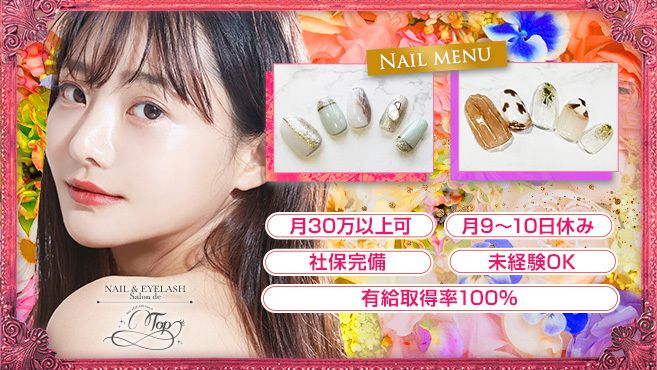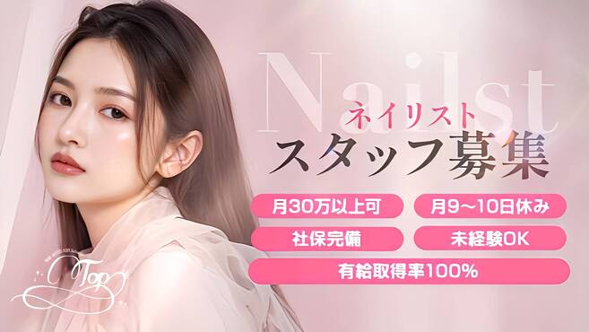 - NAIL&EYELASH Salon de TOPは、この度リニューアルオープン致しました。店内は可愛くお客様からも好評で町田で一番の技術と皆様に愛されるサロンになることはもちろん、 今後の事業拡大、店舗展開も視野に入れ、ネイル&まつエクサロンとしての頂点「TOP」を目指しています! 他のどんなサロンにも負けない技術力とサービス力でお客様への最高のおもてなしを提供します。又、給料や社会完備なども全て揃っていますので、一緒に働ければと思います。ご応募お待ちしています。