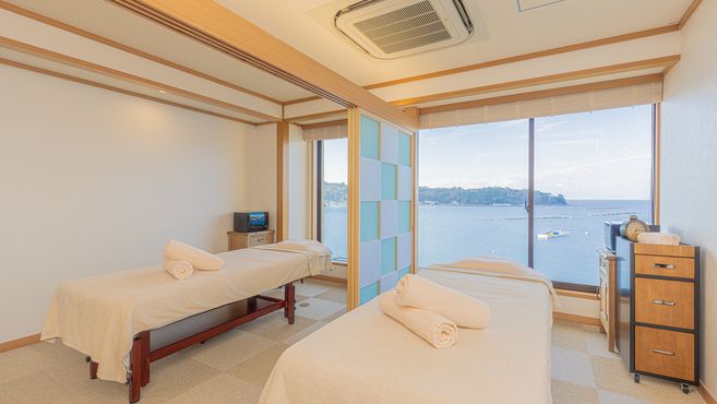 高級老舗旅館内のエステルームは、窓全面にオーシャンビューの贅沢な眺望♪ラグジュアリーな雰囲気のすてきなサロン。少人数サロンなので人間関係も良好です♪