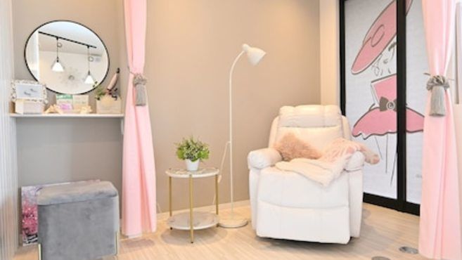 店内はピンク・グレー・ホワイトを基調にした内装。内装・備品等にもこだわりのある店内。