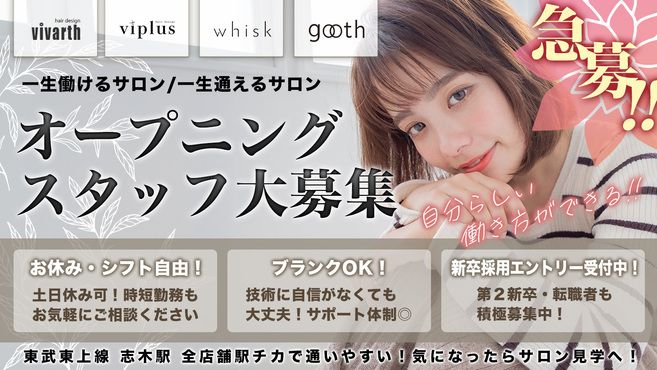 サロン見学からでも大歓迎。皆様のご応募を心よりお待ちしております。志木駅からも近いので通勤も楽ですね。スタイリストの方は新規やフリーのお客様も多いのですぐに入客して成長できる環境です。