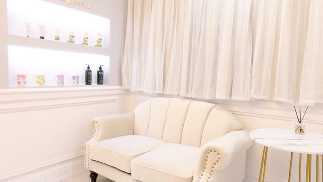 - お店のドアを開けた瞬間から、忙しい日常から解放されてリラックスしていただけるよう、白とベージュを基調としたラグジュアリーな空間に仕立てています。