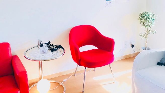 窓が大きく明るく、赤と白を基調にした、風通しの良いサロンです☆*。