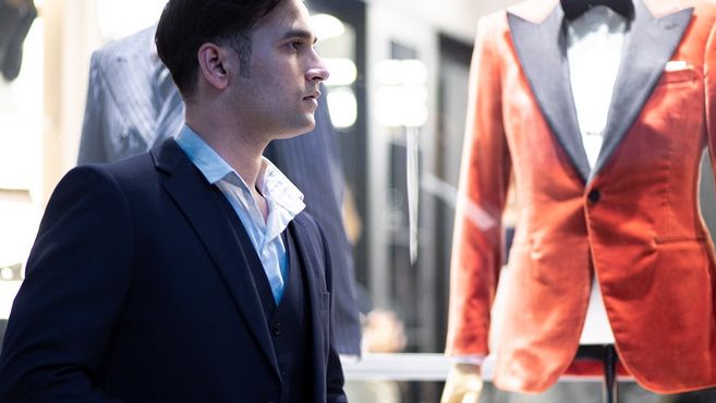 入口を入って左手の、受付正面にはショーケースが。タキシードやオーソドックスなスーツに合わせたイギリスの靴や、メガネ、傘、ペン、様々なシャツに合うカフスが並んでいます。ぜひ、じっくり見てみて下さいね。