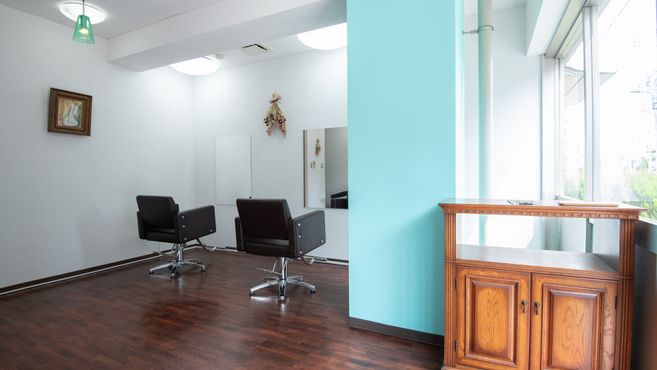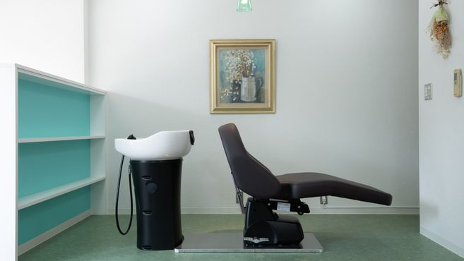 美容室の内装には、リラックスできる空間を提供するための要素も取り入れられています。リクライニングチェアや足元には快適なクッションが置かれ、お客様がくつろげる環境が整えられています。また、柔らかい音楽やアロマの香りも漂い、癒しの空間を作り出しています。