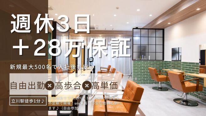 - 高級感ある店内に過ごしやすい清潔感またアットホームなスタッフたちとともに一緒に今後ももっと発展していく立川北口を一緒にトレンドを発信していけるサロンを一緒に作って行きましょう!