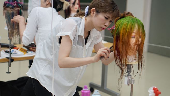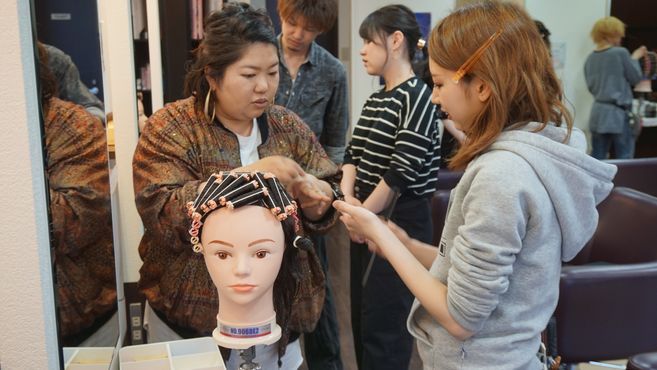 ベテランの先輩がアップ基礎や夜会巻きなど古典スタイルを指導してくれます。