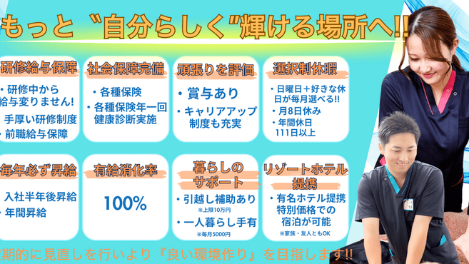 パーソナルジムまであるので患者様の体を知っているからこそ無理なく寄り添いながらサポートしていくことが可能なので患者様との信頼関係もより深めることが出来ます。各分野に分かれて多様なメニューがある為様々な患者様に来ていただけて多くの方と関わることが出来るので自分の経験値が上がり成長を日々実感できるのでやりがいを持って業務に取り組めますよ★
