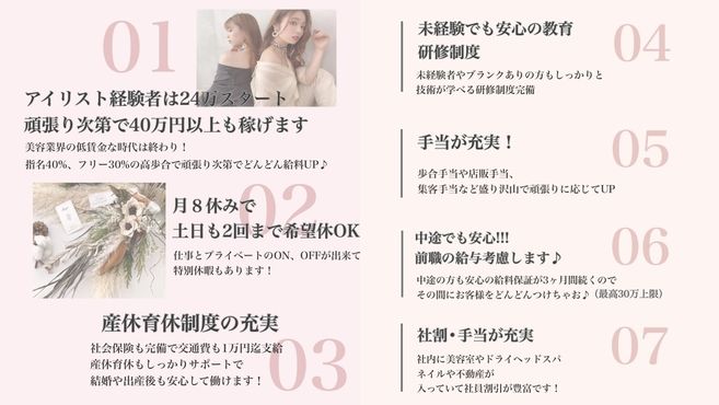 少人数制でお客様、スタッフとしっかりと向き合えます。ベテランアイリストが技術をしっかり指導しますので、ブランクがある方、経験が浅い方のご応募もお待ちしております。また、福利厚生でグループ内のヘアーサロンやドライヘッドスパでの施術割引や弊社不動産でのお引越しにより仲介手数料無料のサービスもございます!是非ご応募お待ちしております!