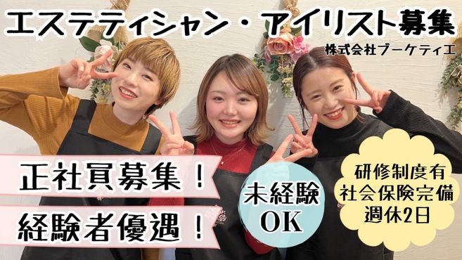 歴8年のベテランをはじめ、歴数ヶ月のスタッフもいます。皆んな共通していることは、明るく元気なところです。そして美容のことが大好きです。経験者も、未経験者も活躍しています。元スポーツ業界やアパレル、美容師など別業種からの転職もいます。明るく元気で、やる気のある方が活躍しています!