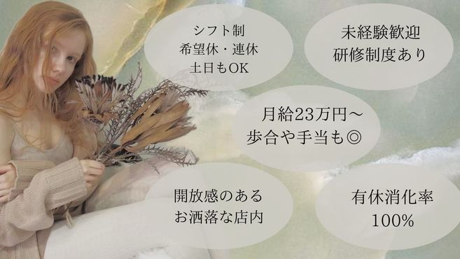 社内の風通しの良く、どんな些細なことでも相談しやすい環境です♪可愛い内装のお店の中で働くこともできます。丁寧な接客と高レベルな技術を1から学べるので、経験者の方はもちろん未経験の方も大歓迎です♪一緒に働ける日を楽しみにしています!