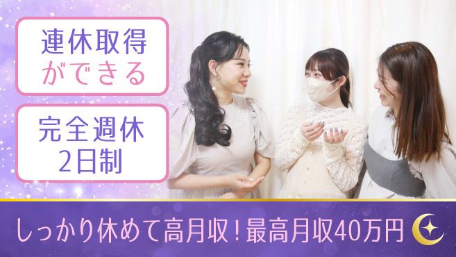 お客様層がとてもいいんです。20代後半から30代中盤の落ち着いた方が多くて、穏やかで優しい人ばかり。学生さんはほとんど来ないので、自分と同世代の方を施術できるので共通の話題で盛り上がることができ接客しやすいですね!