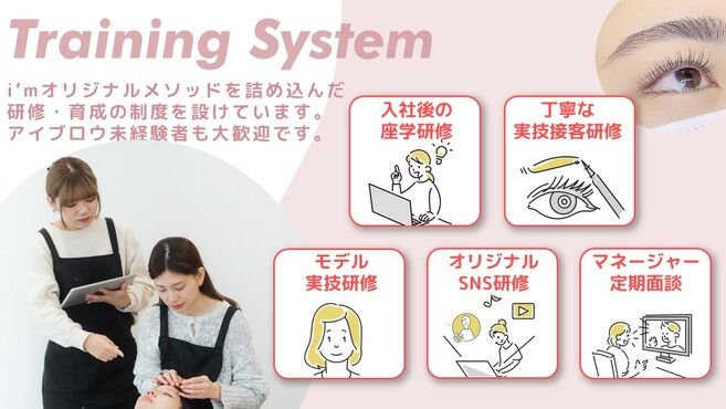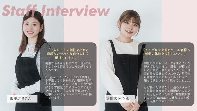 私は当時、アイブロウ自体は未経験だったこともあり、しっかりとした研修制度があることを望んでいました。また、ただ働くだけでなく、他のスタッフと意識を高めあえる環境があるといいなと思っていたので、店舗数が多いこともi'm groupの魅力だなと感じ、入社を決めました。