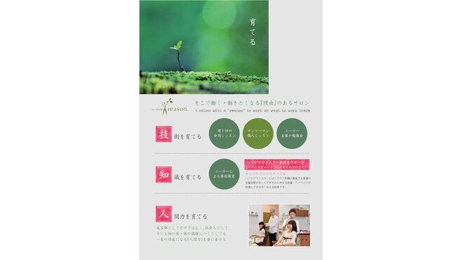 reason.は新しい技術や薬剤を多く取り入れ、楽しく新鮮な職場環境を提供しています。お店で既に決まっている事にとらわれず、新しい【こんなコトやってみたいな】的な意見もどんどん取り入れるので、是非reason.で今までやりたくてもできなかったコトにチャレンジしていただけたらと思います!
